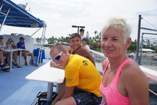 Wie fast jeden Morgen stand als erster Punkt am frühen Morgen Schwimmen auf dem Programm. So gegen 7:00 Uhr sind wir mit dem Auto zum Pier gefahren. Inzwischen ist es morgens schon relativ voll. Es gibt sogar freiwillige Helfer, die auf die persönlichen Sachen aufpassen. Das ist schon ein toller Service. Mein übliches Programm "von Boje zu Boje" zu schwimmen wurde heute etwas abwechslungsreicher, da das Coffeeboat da war. Aufgrund meiner permanenten Übelkeit beschloss ich, erst auf dem Rückweg einen Kaffee zu trinken. Somit konnte ich mich die ganze Schwimmstrecke motivieren und auf den Kaffee freuen. Auf dem Rückweg gab es dann einen leckeren Kaffee. Es sieht schon lustig aus, wenn die Leute im Wasser krampfhaft versuchen, den Kaffeebecher über Wasser zu halten, mich natürlich eingeschlossen. Danach ging es kurz einkaufen und dann gab es ein gemütliches Frühstück auf dem Balkon. Am Mittag stand eine Tour mit dem "Body-Glove Boot an. Es waren Schnorcheln und Baden angesagt. Wieder einmal musste ich feststellen, dass ich weder auf dem Boot noch beim Kraulen Seetauglich bin. Erfreulich war jedoch, dass wir während der Fahrt Delphine gesehen haben. Tolle Tiere. Am Nachmittag gab es noch etwas Gymnastik sowie relaxen. Nach dem Abendessen noch gemütlich den Abend ausklingen lassen. Übrigens, Timo Bracht ist ebenfalls in unserem Hotel