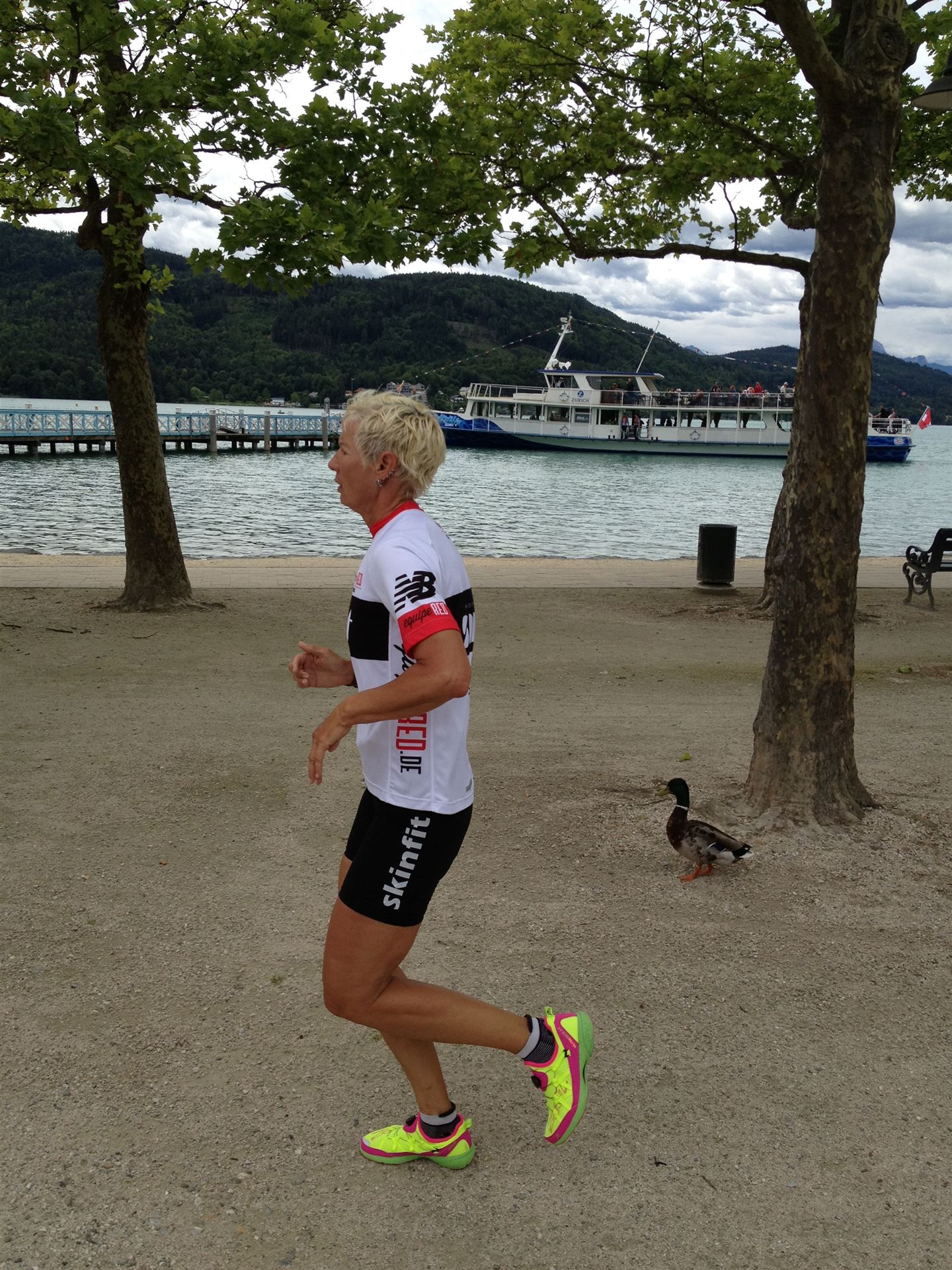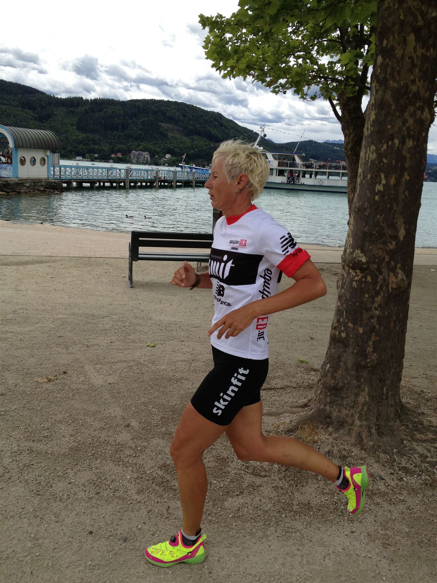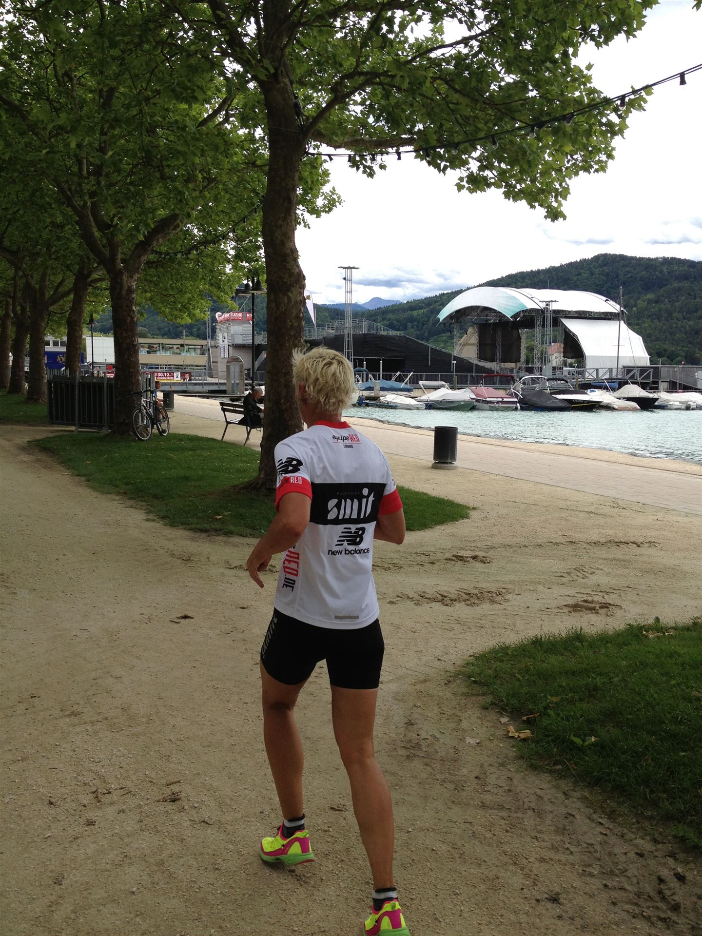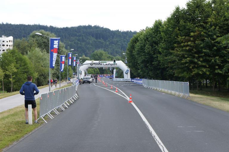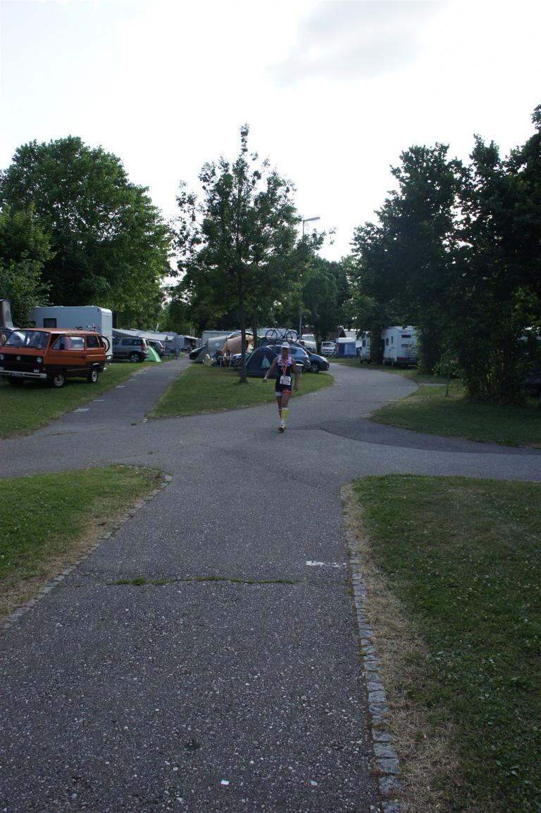 Das Wetter ist prima, die Temperatur liegt bei ca. 26 Grad im Schatten. Es werden 2 Runde á 21 km gelaufen. Von der Wechselzone geht es am Anfang entlang der Lende in Richtung Krumpendorf. In Krumpendorf läuft man eine kurze Strecke durchs Schwimmbad. Es ist schon etwas ungewöhnlich die Badegäste auf den Grünanlagen liegen zu sehen. Danach geht es entlang der Lende nach Klagenfurt Stadtmitte. Einmal um das Wahrzeichen, den Lindwurm herum und wieder zurück in Richtung Ziel. Die Strecke ist sehr abwechslungsreich, es stehen viele Freunde, Familie und Zuschauer an der Strecke. Aufgrund des Gegenverkehrs der anderen Läufer hat man immer etwas zu schauen. Das Anfeuern durch die Zuschauer puscht jeden Athleten. Die Schmerzen sind alle vergessen, man genießt die tolle Stimmung. Auf der 2. Runde habe ich leichte Probleme mit den Oberschenkeln und den Waden. Ich lasse mich davon jedoch nicht beirren, einfach nur weiterlaufen. Die Unterführung nach Klagenfurt sowie die Bordsteinkanten in der Stadtmitte bereiten mir etwas Probleme, aber egal, da macht man einfach etwas langsam.