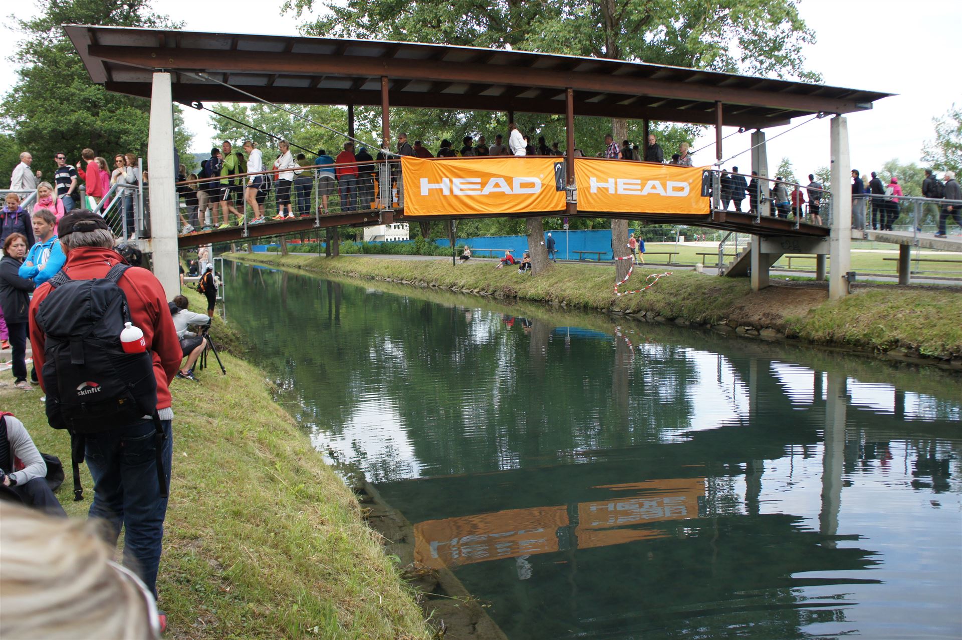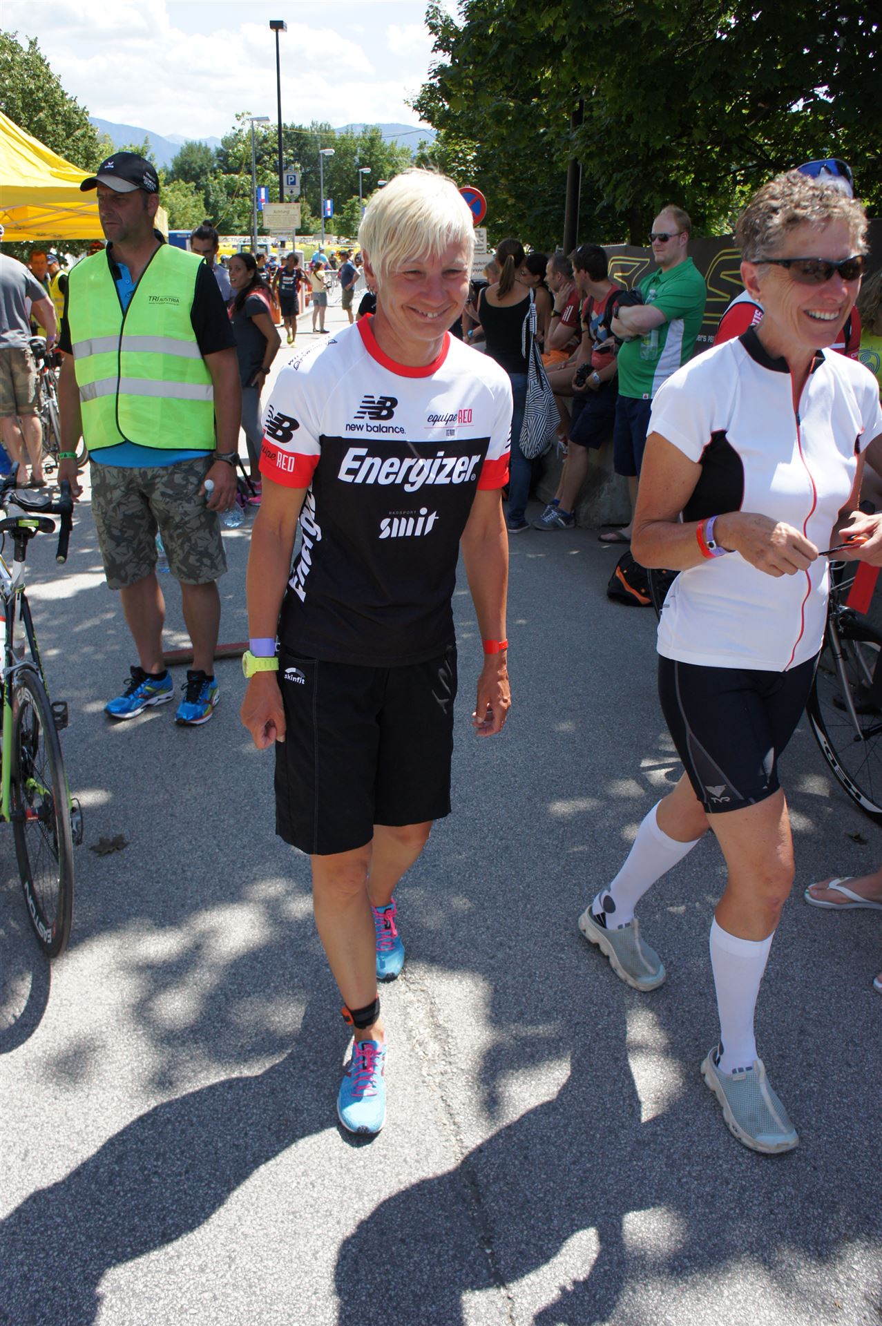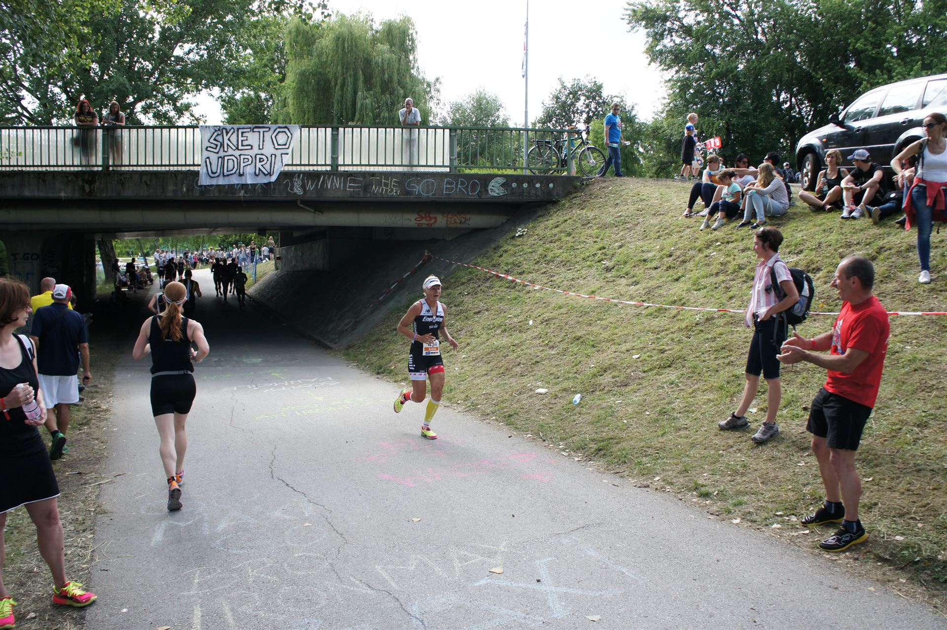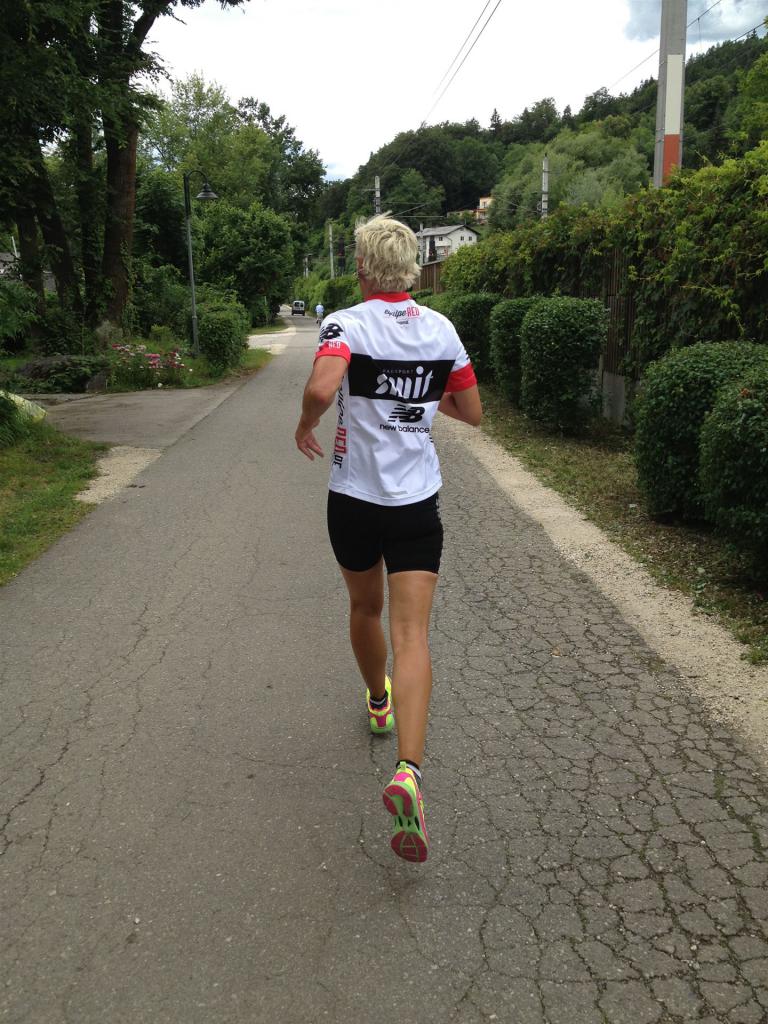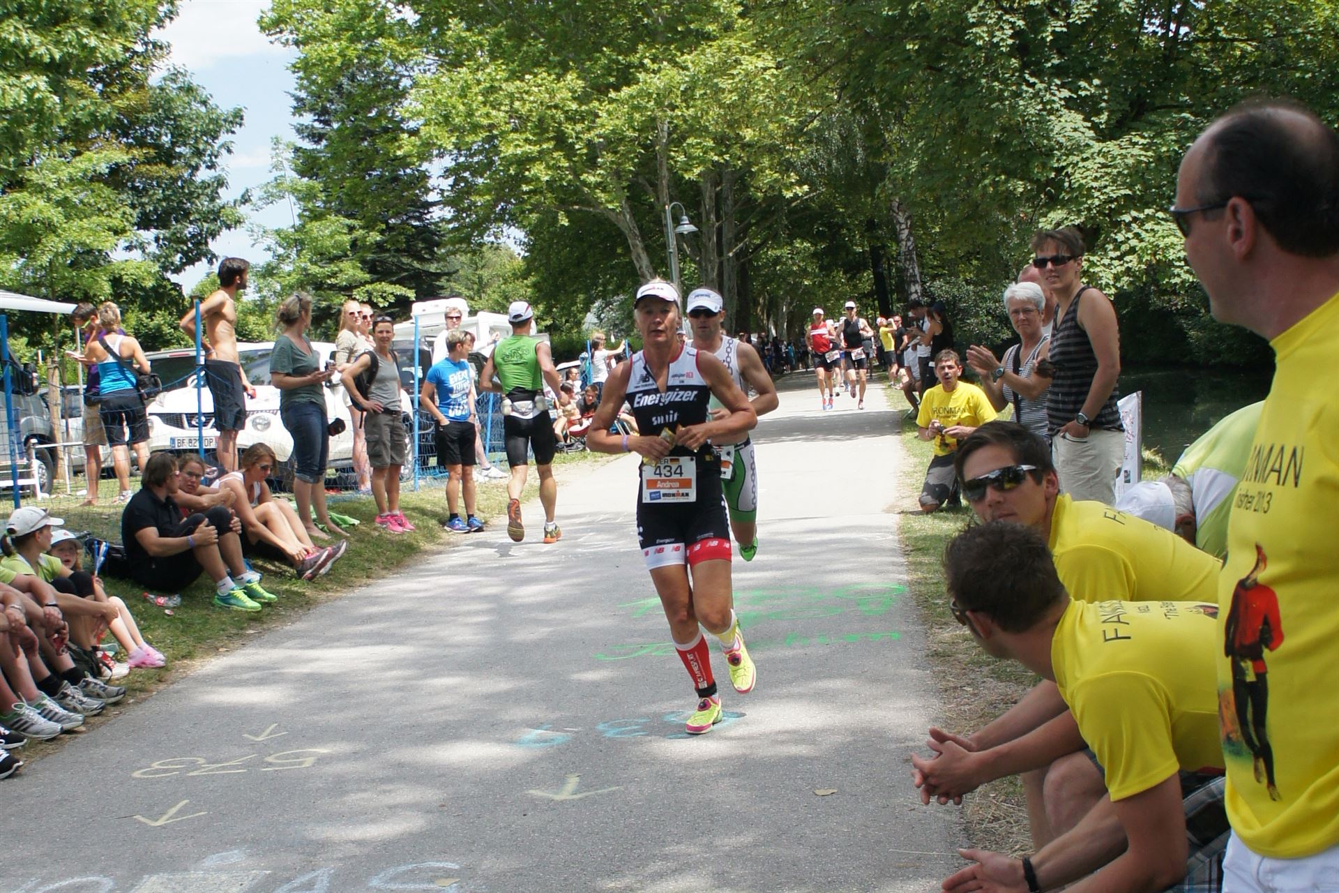 Das Wetter ist prima, die Temperatur liegt bei ca. 26 Grad im Schatten. Es werden 2 Runde á 21 km gelaufen. Von der Wechselzone geht es am Anfang entlang der Lende in Richtung Krumpendorf. In Krumpendorf läuft man eine kurze Strecke durchs Schwimmbad. Es ist schon etwas ungewöhnlich die Badegäste auf den Grünanlagen liegen zu sehen. Danach geht es entlang der Lende nach Klagenfurt Stadtmitte. Einmal um das Wahrzeichen, den Lindwurm herum und wieder zurück in Richtung Ziel. Die Strecke ist sehr abwechslungsreich, es stehen viele Freunde, Familie und Zuschauer an der Strecke. Aufgrund des Gegenverkehrs der anderen Läufer hat man immer etwas zu schauen. Das Anfeuern durch die Zuschauer puscht jeden Athleten. Die Schmerzen sind alle vergessen, man genießt die tolle Stimmung. Auf der 2. Runde habe ich leichte Probleme mit den Oberschenkeln und den Waden. Ich lasse mich davon jedoch nicht beirren, einfach nur weiterlaufen. Die Unterführung nach Klagenfurt sowie die Bordsteinkanten in der Stadtmitte bereiten mir etwas Probleme, aber egal, da macht man einfach etwas langsam.