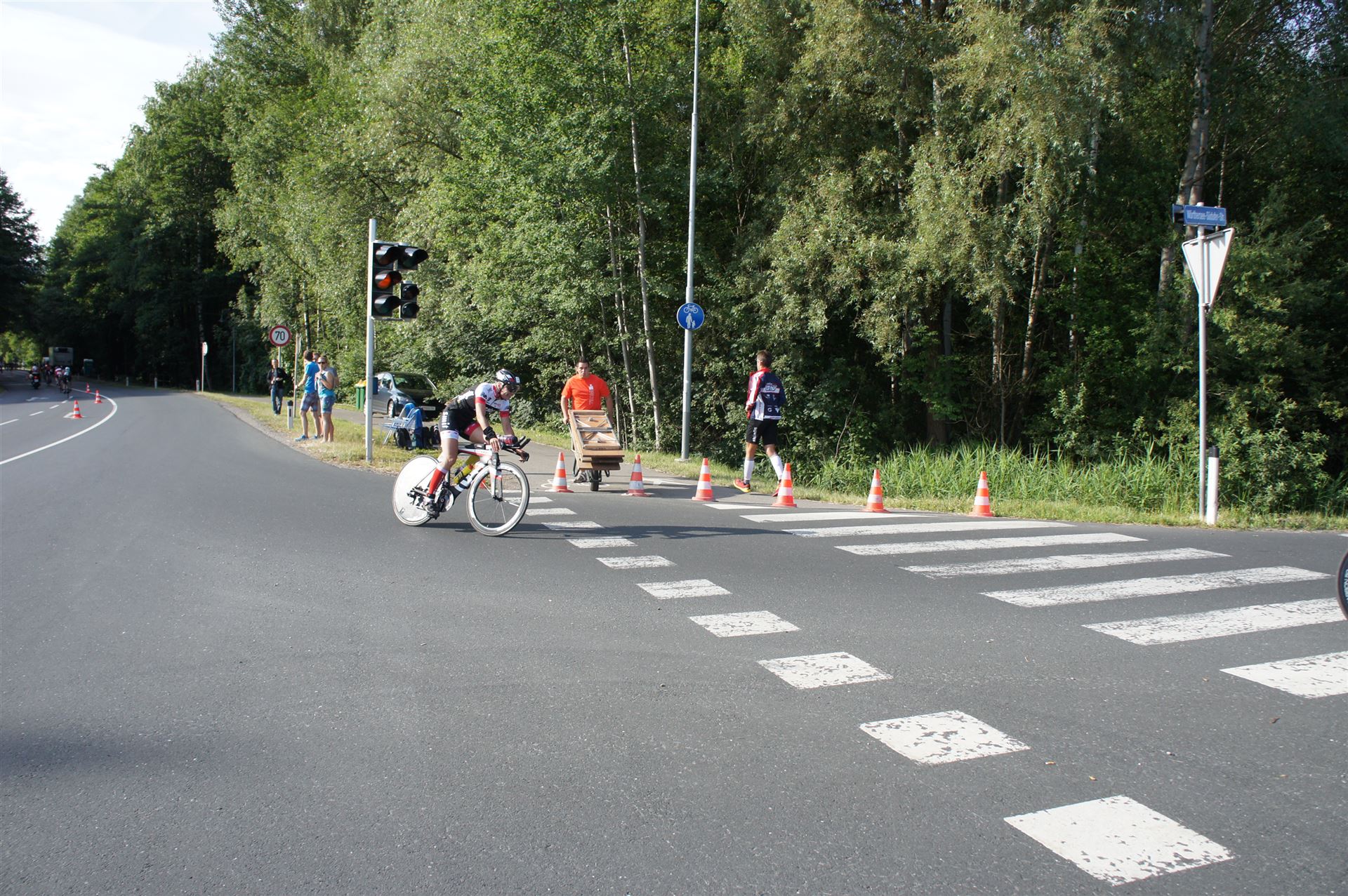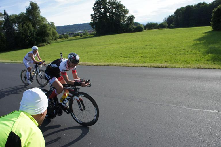 Auf der ersten Runde sind relativ viele Triathleten unterwegs. Es ist mitunter nicht so einfach, keinen Windschatten des Vordermannes zu nutzen. In der 2. Runde hat sich das Feld etwas auseinander gezogen, so dass man etwas entspannter fahren kann.