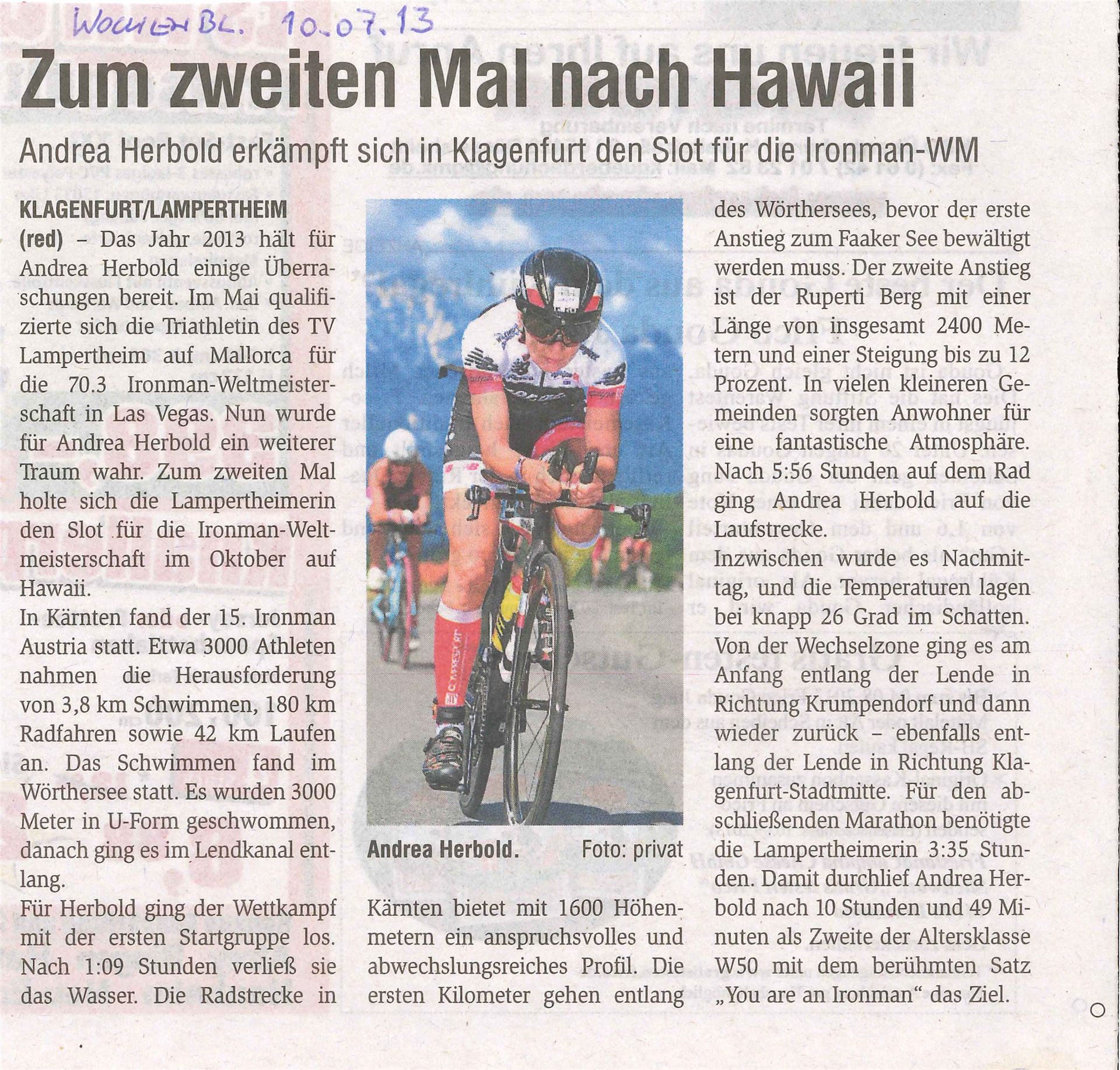 Der erste Anstieg am Faaker See ist immer wieder eine tolle Erfahrung. Bei einer Steigung von bis zu 10 % muss man schon kräftig in die Pedale treten. Die Zuschauer stehen Spalier, da darf man keine Schwäche zeigen. Der zweite und bekannteste Anstieg, der Ruperti Berg ist mit einer Länge von 2.400 Metern und einer maximalen Steigung von 14 % für jeden Triathleten eine Herausforderung.