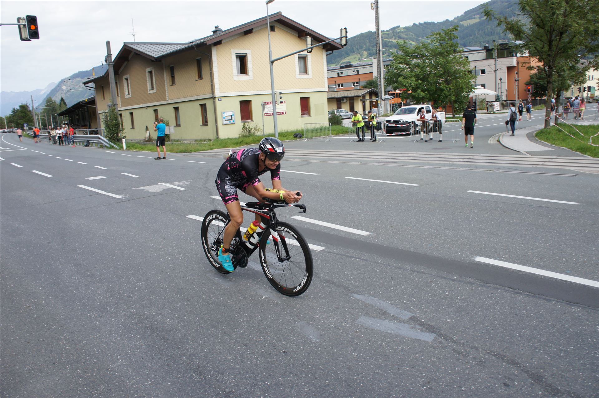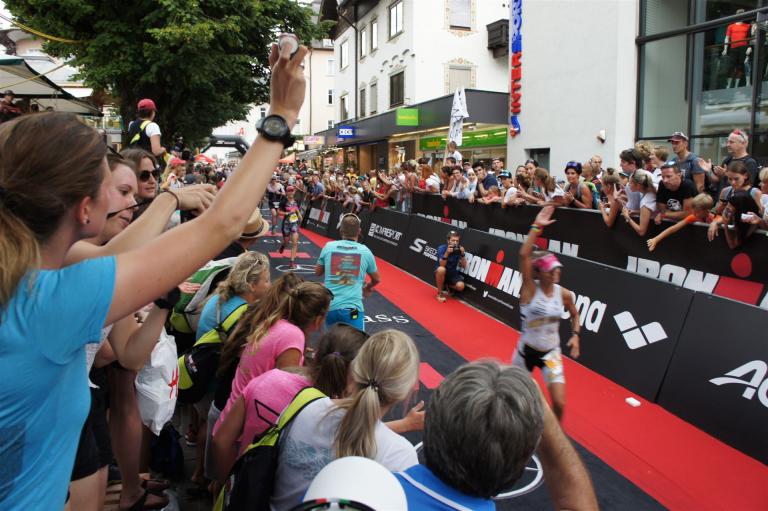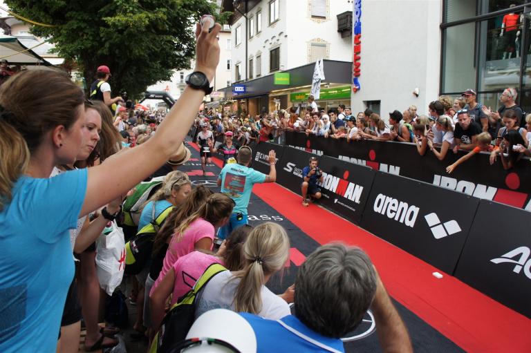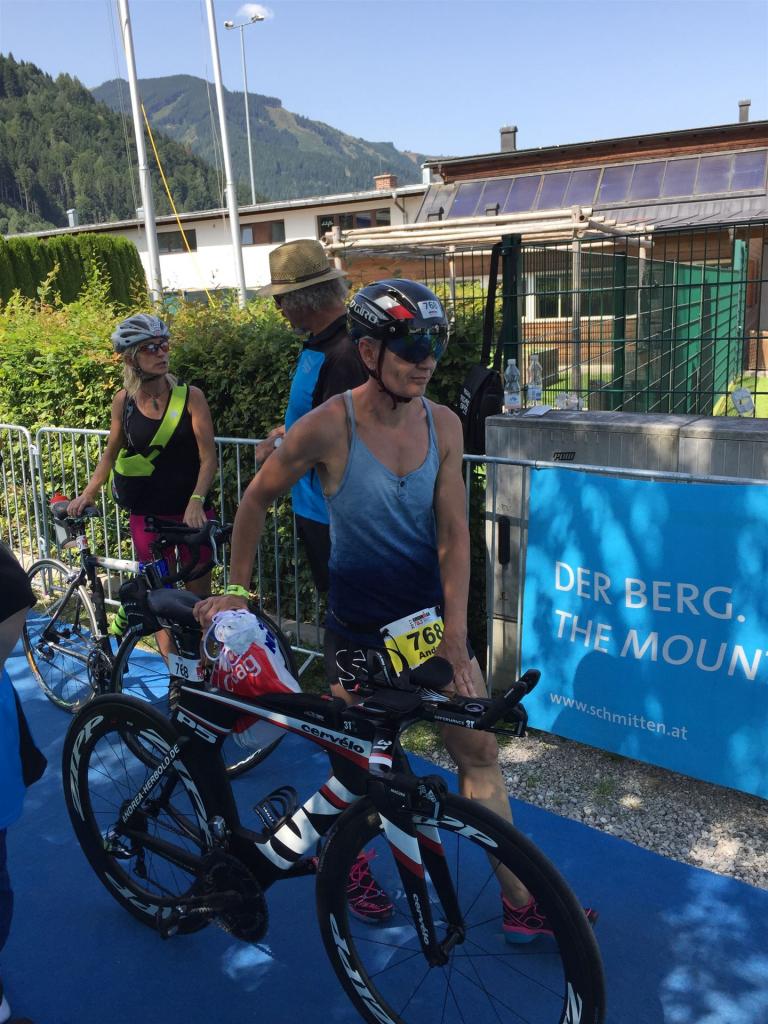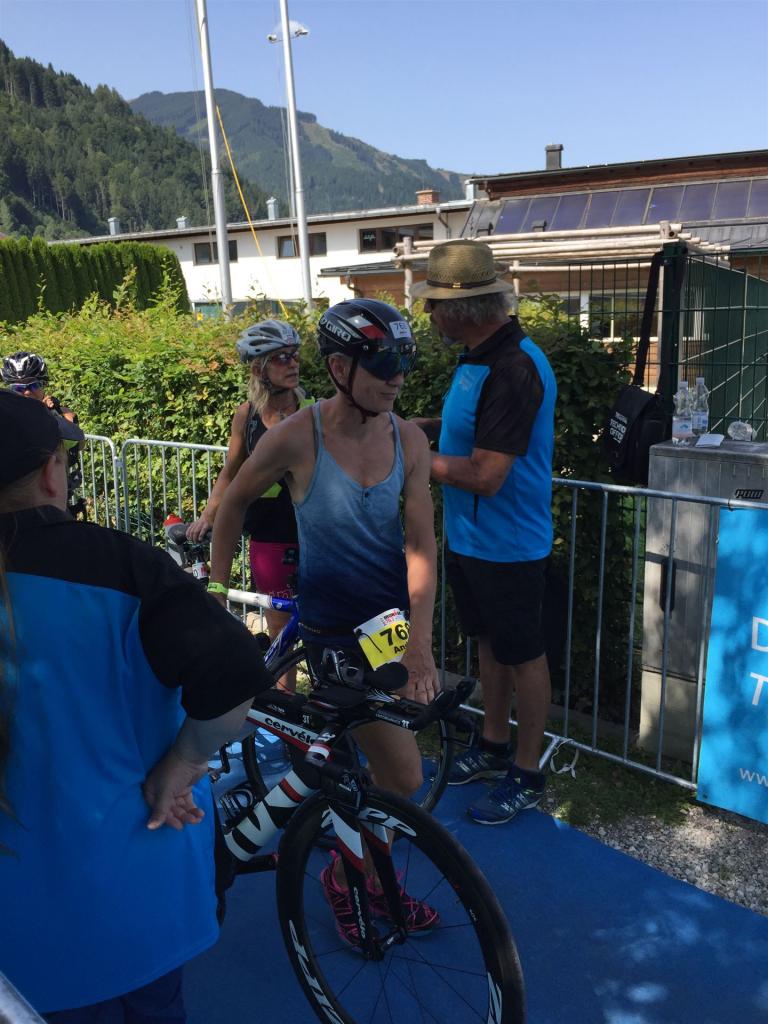 Schnell in die Wechselzone umziehen und dann aufs Rad. Es wird eine Runde mit insgesamt 870 Höhenmetern gefahren. Die ersten Kilometer sind meist flach, es läuft wunderbar. Ein 13 Kilometer langer Anstieg nach Dienten ist eines der Highlights der Radstrecke. Die ersten sechs Kilometer steigt die Strecke mit etwa 5,5 Prozent Steigung gemächlich an. Wer hier das Tempo zu hoch wählt, dem stellt sich auf den letzten zwei Kilometer mit bis zu 14 % Steigung eine Mauer auf. Leider habe ich, wie bereits in Klagenfurt, Probleme mit dem unteren Rücken. Ich versuche die Schmerzen zu verdrängen und mein Tempo zu fahren. Ich teile mir mein Tempo richtig ein und kurble den Berg hoch. Gefühlt werde ich von vielen überholt, ich behalte jedoch mein Tempo bei. Die Aussicht ist einfach phantastisch, ich versuche trotz Wettkampf die Strecke zu genießen. Am Filzensattel ist der höchste Punkt der Strecke erreicht, von 1.285 Metern Seehöhe geht es wieder bergab. Da ich die Strecke zum ersten Mal fahre bin ich etwas vorsichtig. Die Abfahrt ist am Anfang technisch sehr anspruchsvoll. Starkes Gefälle (15 %) und enge Kurven wechseln sich ab. Die Strecke ist jedoch hervorragend ausgezeichnet. Alle Kurven sind mit Schriftzeichen auf der Straße und Schildern markiert. Es wurde versucht alle Unebenheiten, Kanaldeckeln, Schlaglöcher … farblich zu markieren. Beeindruckend wieviel Mühe sich das Team hier gegeben hat. Im Zentrum von Kaprun ist eine ganz tolle Stimmung. Generell sind sehr viele Zuschauer auf der Strecke um die Athleten anzufeuern. Nach 3:08:14 Stunden steige ich vom Rad und es folgt die letzte Disziplin, das Laufen.