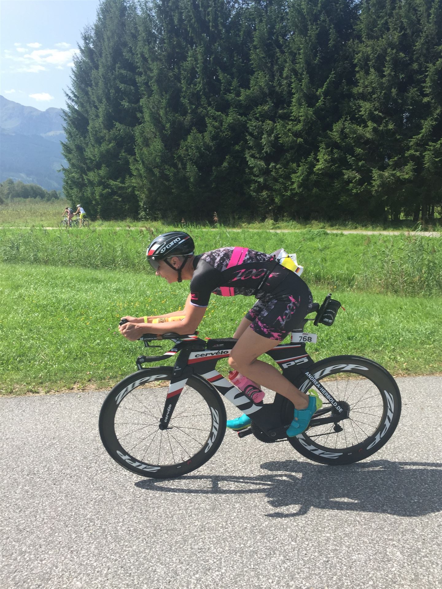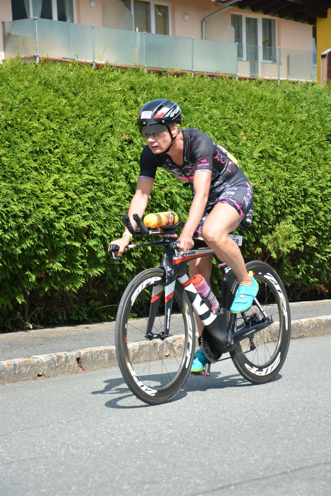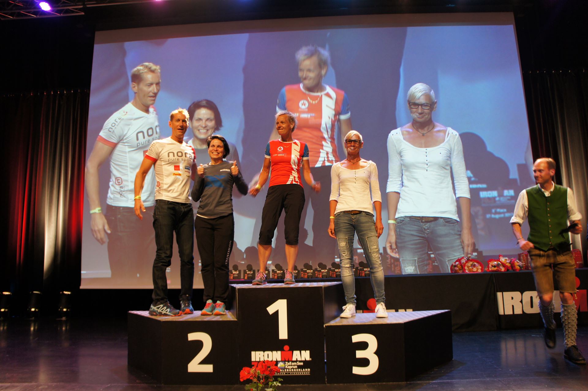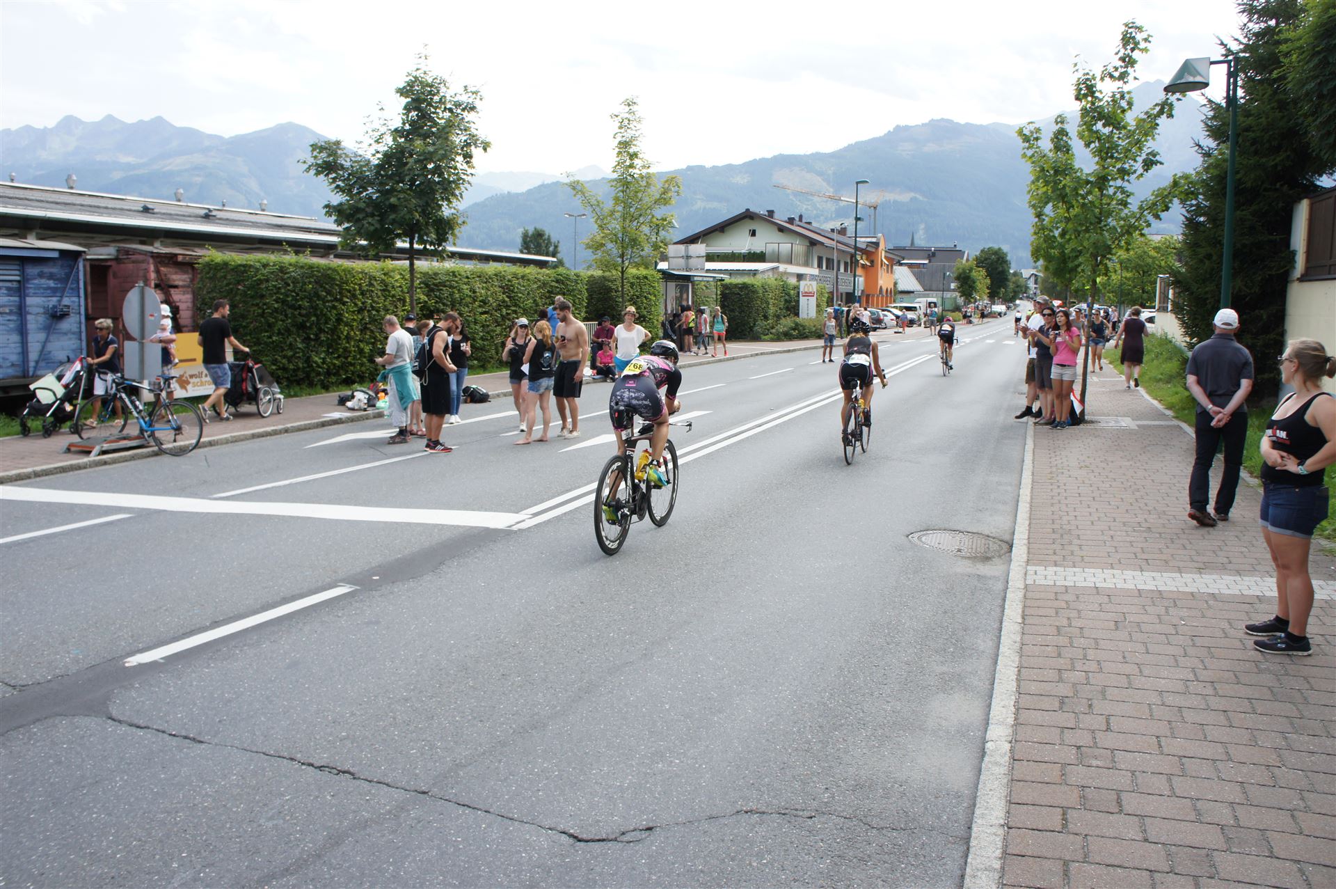 Schnell in die Wechselzone umziehen und dann aufs Rad. Es wird eine Runde mit insgesamt 870 Höhenmetern gefahren. Die ersten Kilometer sind meist flach, es läuft wunderbar. Ein 13 Kilometer langer Anstieg nach Dienten ist eines der Highlights der Radstrecke. Die ersten sechs Kilometer steigt die Strecke mit etwa 5,5 Prozent Steigung gemächlich an. Wer hier das Tempo zu hoch wählt, dem stellt sich auf den letzten zwei Kilometer mit bis zu 14 % Steigung eine Mauer auf. Leider habe ich, wie bereits in Klagenfurt, Probleme mit dem unteren Rücken. Ich versuche die Schmerzen zu verdrängen und mein Tempo zu fahren. Ich teile mir mein Tempo richtig ein und kurble den Berg hoch. Gefühlt werde ich von vielen überholt, ich behalte jedoch mein Tempo bei. Die Aussicht ist einfach phantastisch, ich versuche trotz Wettkampf die Strecke zu genießen. Am Filzensattel ist der höchste Punkt der Strecke erreicht, von 1.285 Metern Seehöhe geht es wieder bergab. Da ich die Strecke zum ersten Mal fahre bin ich etwas vorsichtig. Die Abfahrt ist am Anfang technisch sehr anspruchsvoll. Starkes Gefälle (15 %) und enge Kurven wechseln sich ab. Die Strecke ist jedoch hervorragend ausgezeichnet. Alle Kurven sind mit Schriftzeichen auf der Straße und Schildern markiert. Es wurde versucht alle Unebenheiten, Kanaldeckeln, Schlaglöcher … farblich zu markieren. Beeindruckend wieviel Mühe sich das Team hier gegeben hat. Im Zentrum von Kaprun ist eine ganz tolle Stimmung. Generell sind sehr viele Zuschauer auf der Strecke um die Athleten anzufeuern. Nach 3:08:14 Stunden steige ich vom Rad und es folgt die letzte Disziplin, das Laufen.