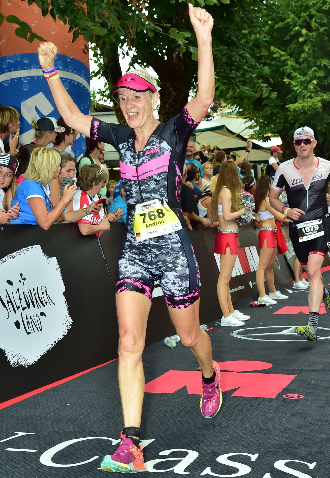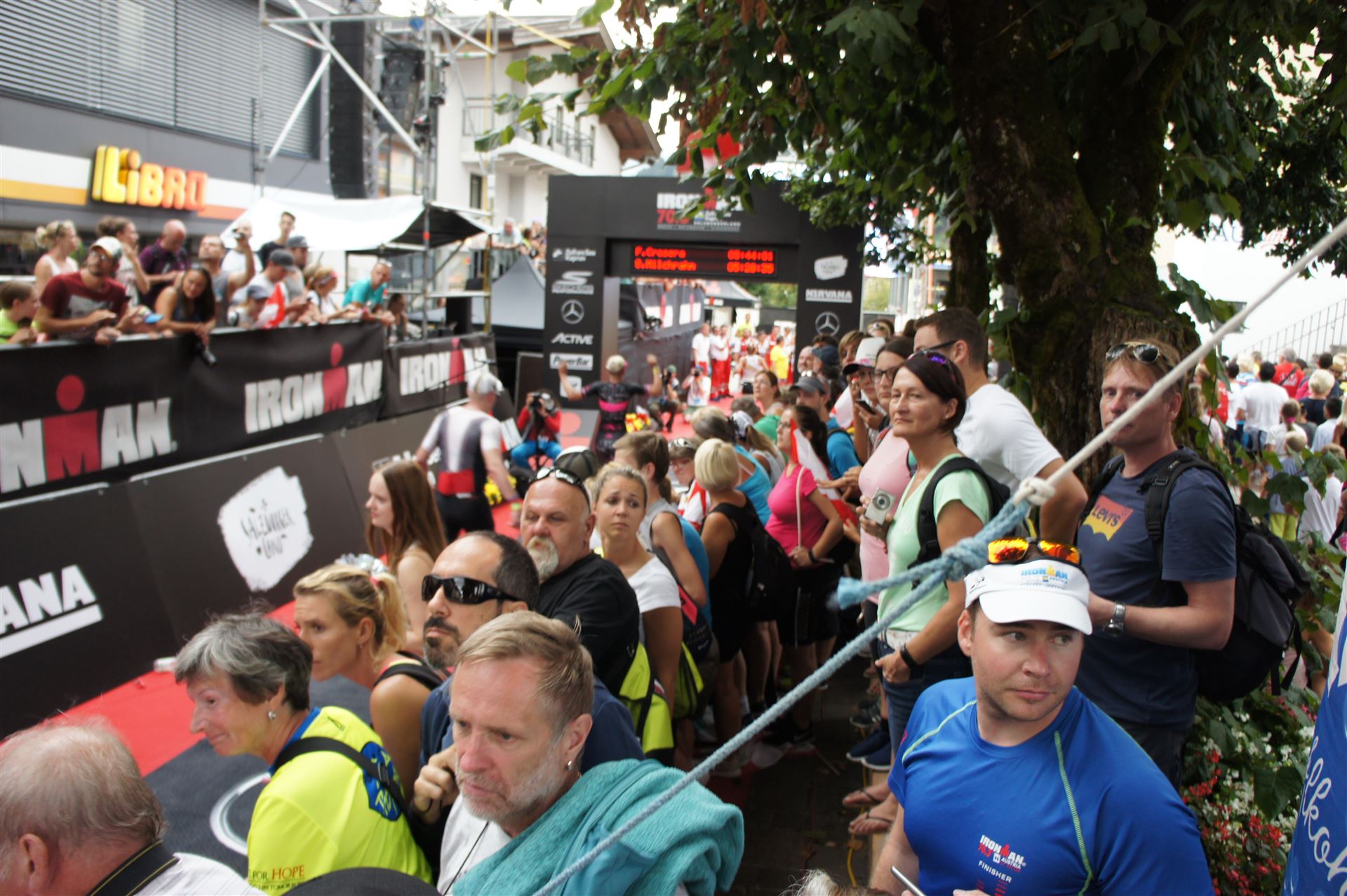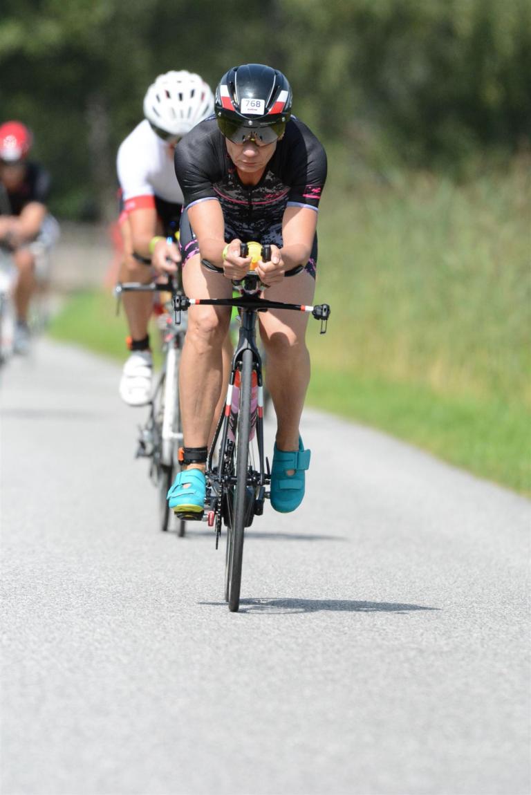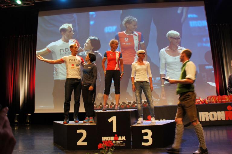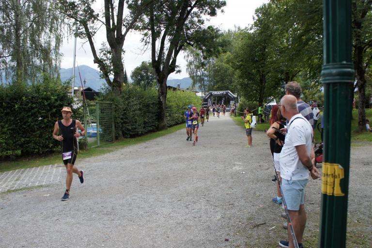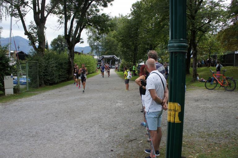 Die ersten 2-3 Kilometer fallen mir sehr schwer. Die Beine sind müde und ich kann mein Tempo nicht finden, was sehr ungewöhnlich für mich ist. Normalerweise habe ich keine Anlaufprobleme nach dem Rad. Meinem Rücken geht es sehr gut, daran kann es nicht liegen. Nachdem ich eine Runde durch die Stadt gelaufen bin und die Zuschauer mich angefeuert und motiviert haben geht es mir langsam besser. Mein Kopf ist positiv und die nächsten 18 Kilometer können kommen. Die Strecke führt am See entlang, ein tolles Panorama. Die Strecke ist teilweise Asphalt aber auch viel Schotter. Man gewöhnt sich irgendwann an den Schotter, die Zuschauer und die tolle Strecken helfen dabei. Gesamt werden 2 Runden mit einigen hoch-tief Passagen gelaufen. Das Ziel ist direkt in der Stadt. Die Finisherline ist voll, man wird angefeuert, es wird gejubelt, eine ganz tolle Stimmung. Für den Halbmarathon habe ich eine Zeit von 1:53:04 benötigt.