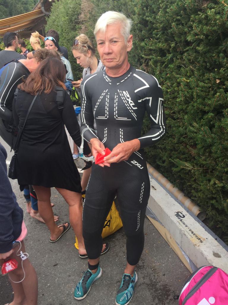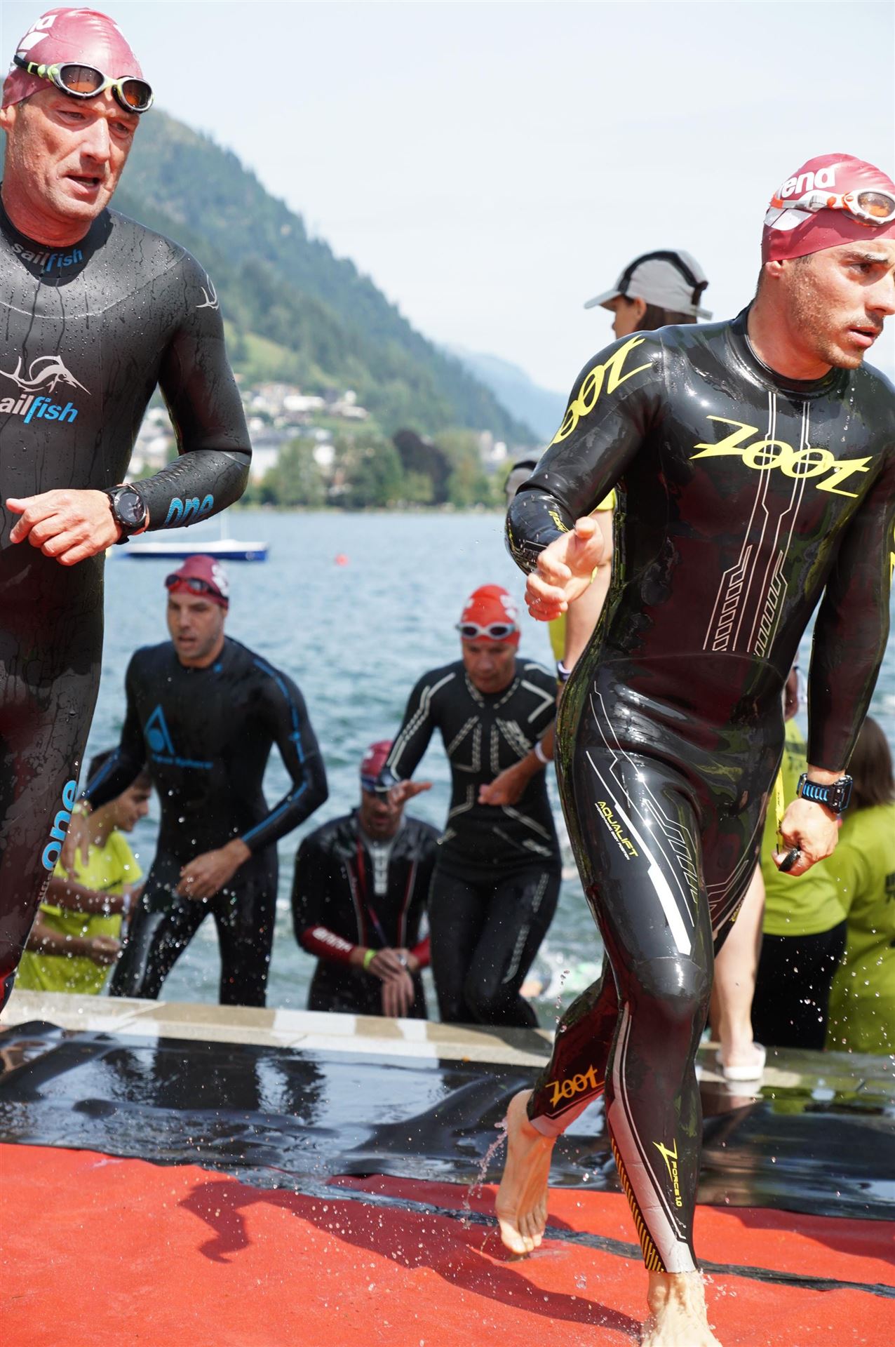Um 11:00 Uhr fällt der Startschuss für die Profis Männer (eine sehr humane Zeit, man muss nicht so früh aufstehen). Die Sonne kommt langsam aus den Wolken hervor, die umliegenden Berge ergeben ein tolles Panorama. Bei diesem Anblick kann es nur ein toller Wettkampf werden. Direkt nach den Männern gehen die Profi–Frauen an den Start. Einige Minuten später beginnt für die Agegrouper der Rollingstart. Alle Sekunden gehen einige Athleten ins Wasser. Ich habe mich entsprechend meiner Schwimmzeit im Block 30-35 Minuten eingeordnet. Es wird eine Runde geschwommen. Der Kurs geht gerade aus bis zur großen Boje und wieder zurück. Das Schwimmen ist komplett Stressfrei. Durch das rollierende System gibt es kein Gehaue und Gedränge. Jeder kann seinen Rhythmus schwimmen. Nach 0:35:32 Minuten komme ich entspannt aus dem Wasser. Inzwischen scheint die Sonne, es wird ein wunderbarer Tag.