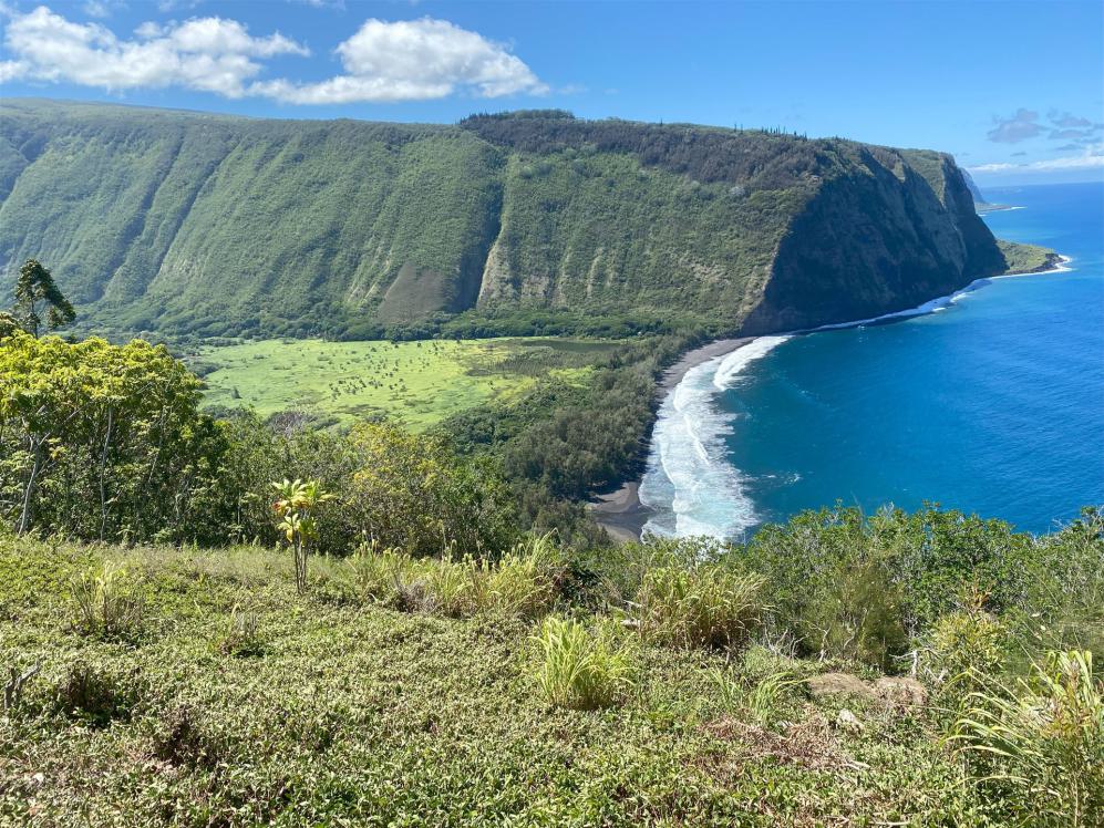 Ein ganz toller Aussichtspunkt, bei welchem man den „Waipi’o Valley Black Sand Beach“ sehen kann.